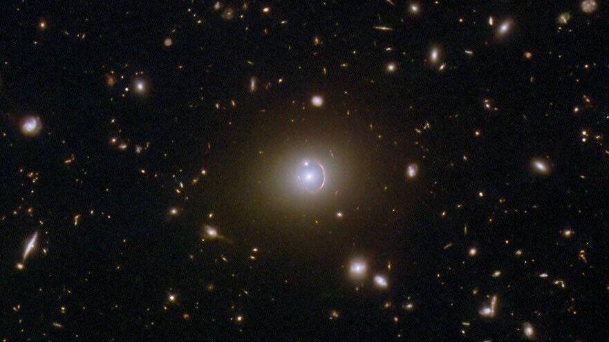Кольцо Эйнштейна - это искаженное под действием гравитационного линзирования изображение источника света в космосе, принимающее форму кольца. Три галактики, запечатленные "Хабблом", находятся на разных расстояниях от Земли: 19,5, 5,5 и 2,7 миллиарда световых лет. Согласно НАСА, упорядоченное расположение этих галактик создает гравитационную линзу, известную как кольцо Эйнштейна.